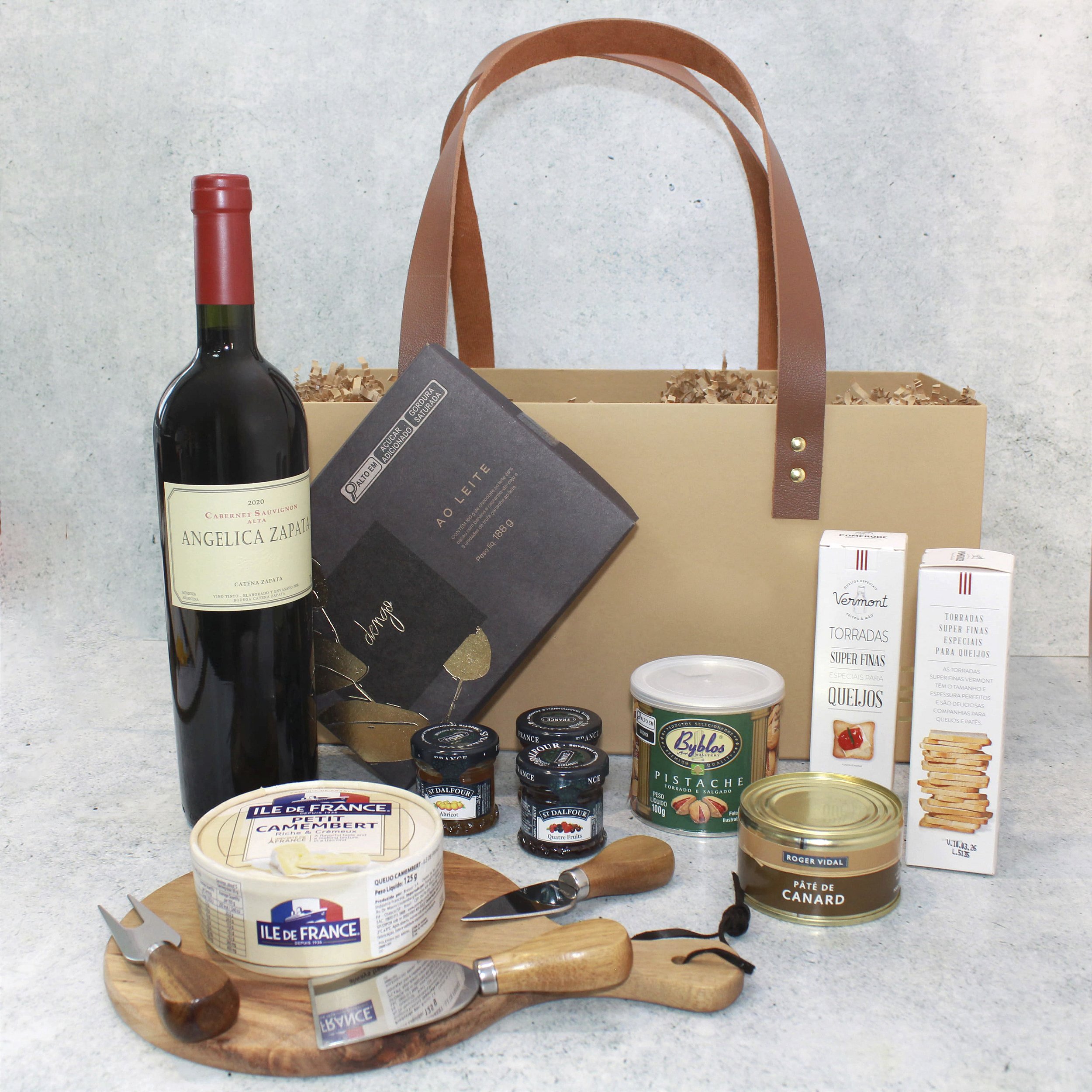 O Kit Vinho Angelica Zapata & Gourmet Selection une o vinho encorpado 🍷, a sofisticação do Queijo Brie Au Bleu 🧀, trufas e bombons artesanais 🍫, patê refinado 🦆, geleias delicadas 🍓 e pistaches crocantes 🌰.