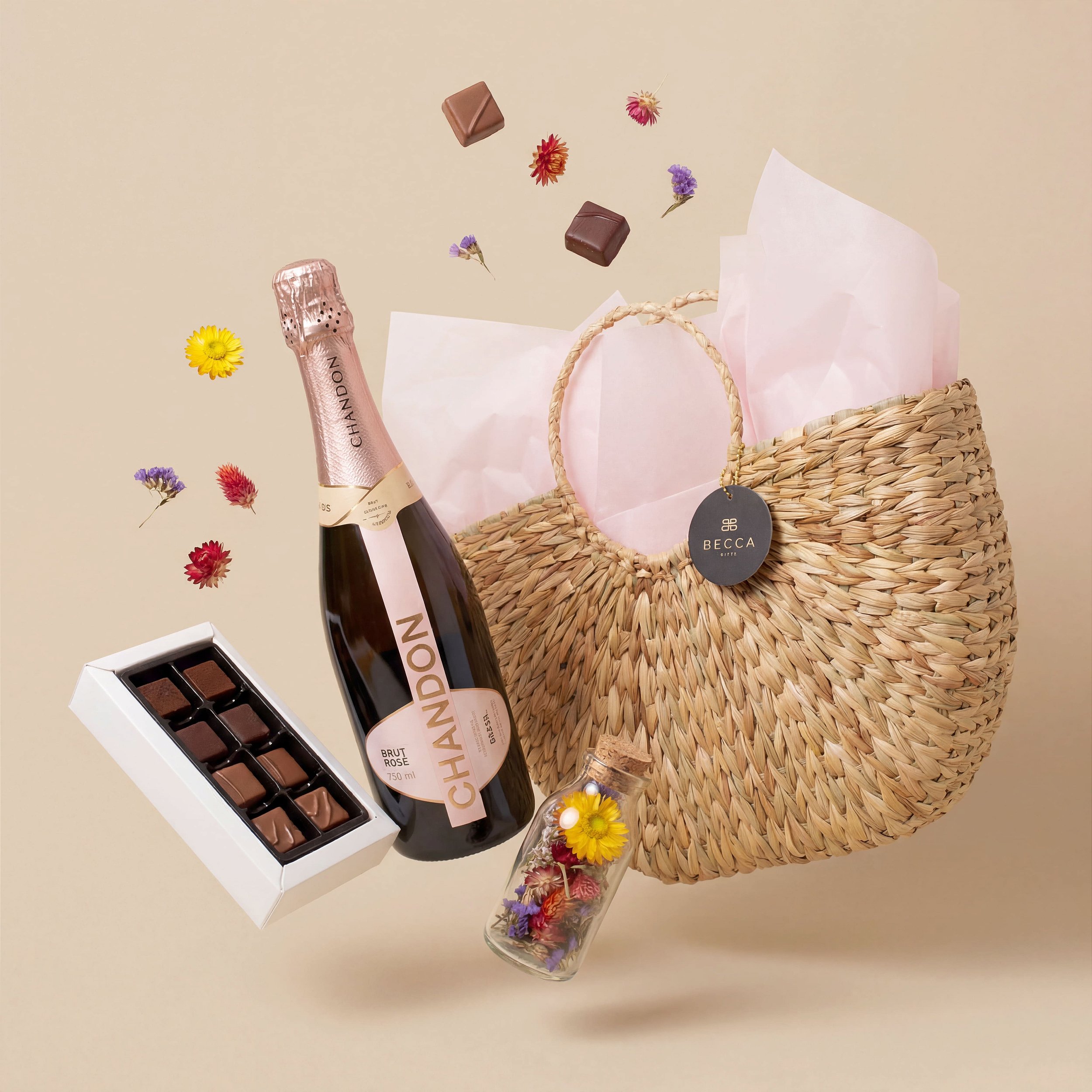 Cada detalhe foi cuidadosamente pensado: do espumante consagrado às ganaches artesanais, passando pela delicadeza das flores secas e o acabamento do cesto.