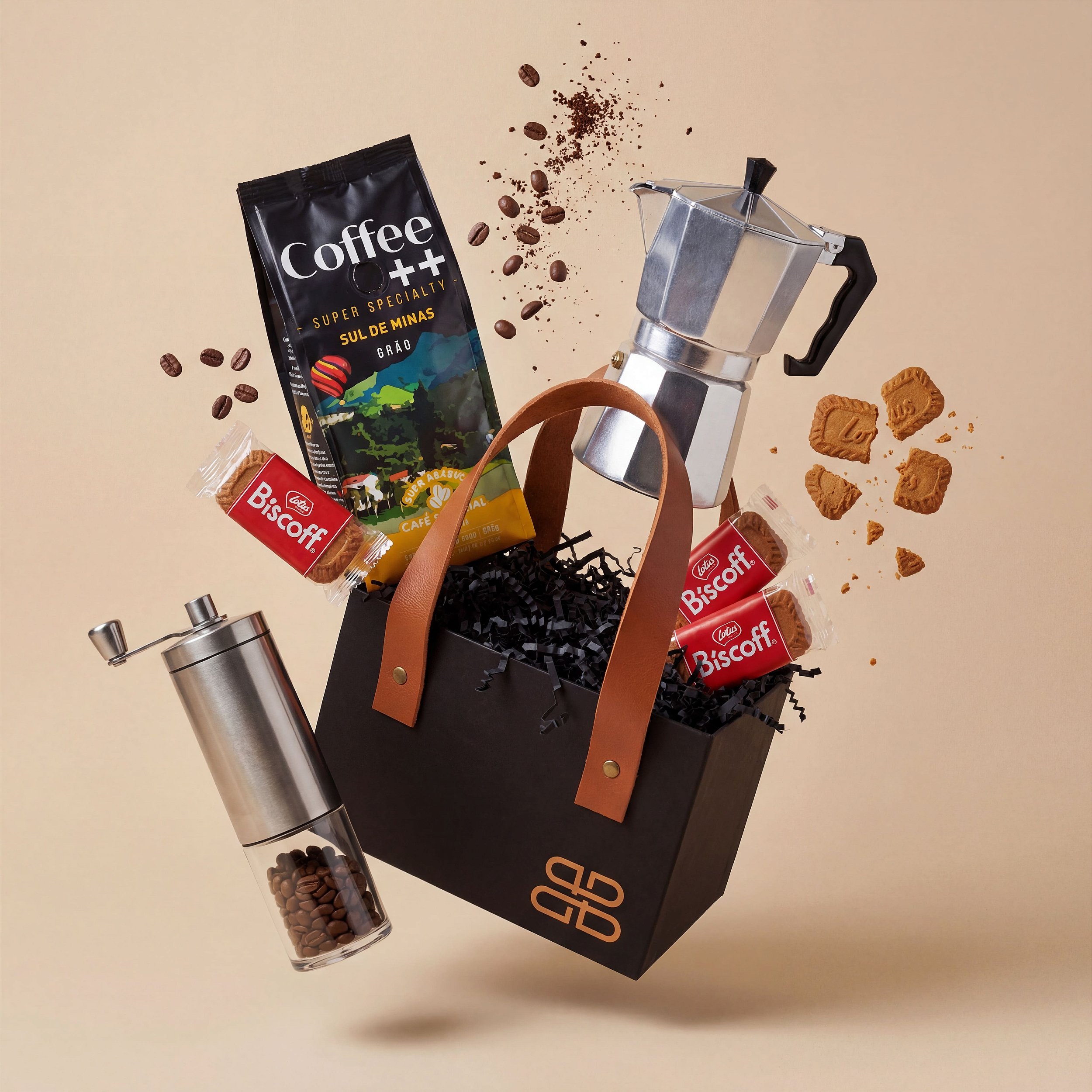 O Gift Box Café & Biscoff Experiência Gourmet Becca une café em grãos de alta qualidade ☕, preparo artesanal 🇮🇹, moagem fresca ⚙️ e o toque doce e sofisticado do Biscoito Biscoff Lotus 🍪.