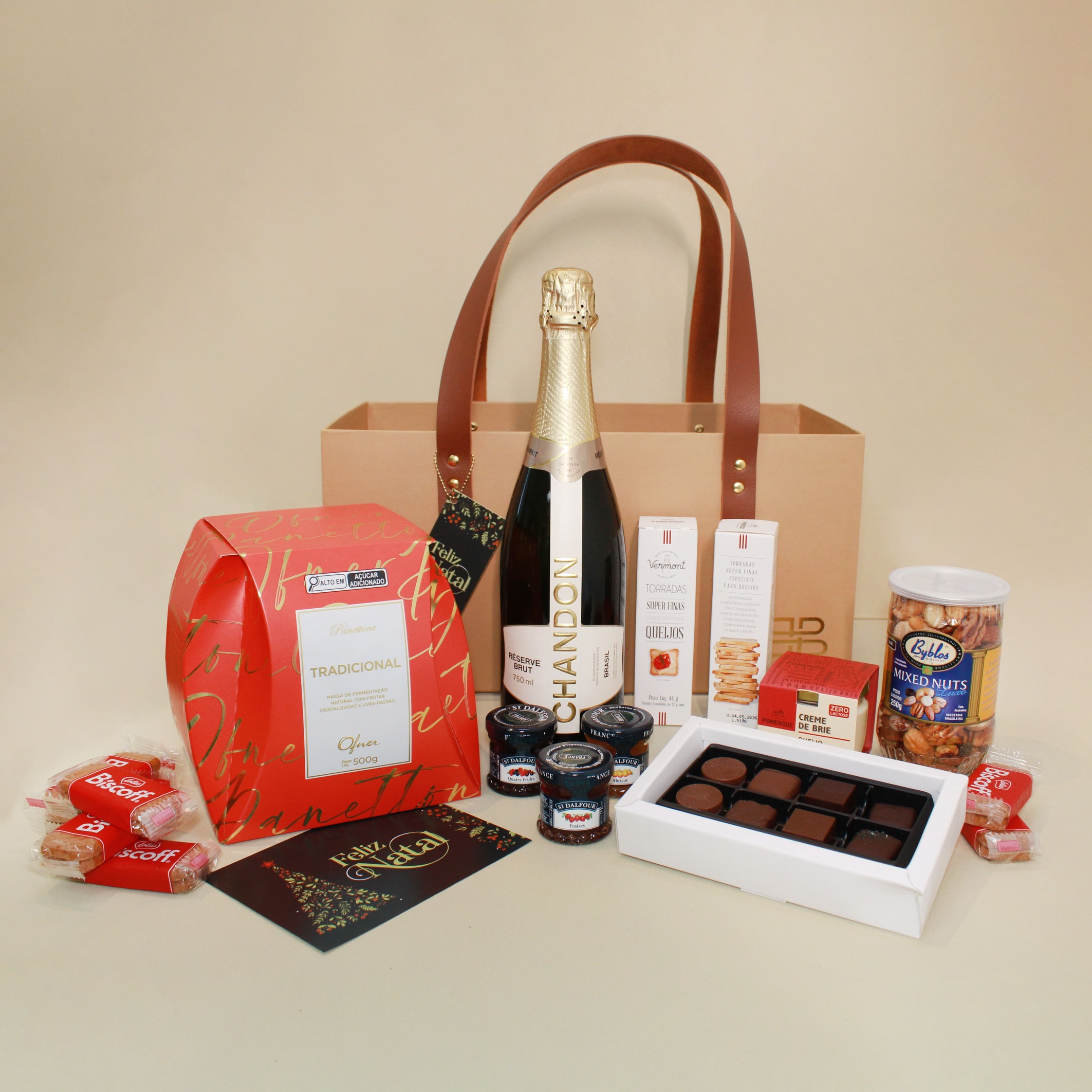 O Kit Cesta Natalina Gourmet Chandon e Ofner é uma combinação perfeita de sabores e carinho. Inclui Espumante, Panettone artesanal e delícias gourmet GiftBox Picnic Becca Gifts.