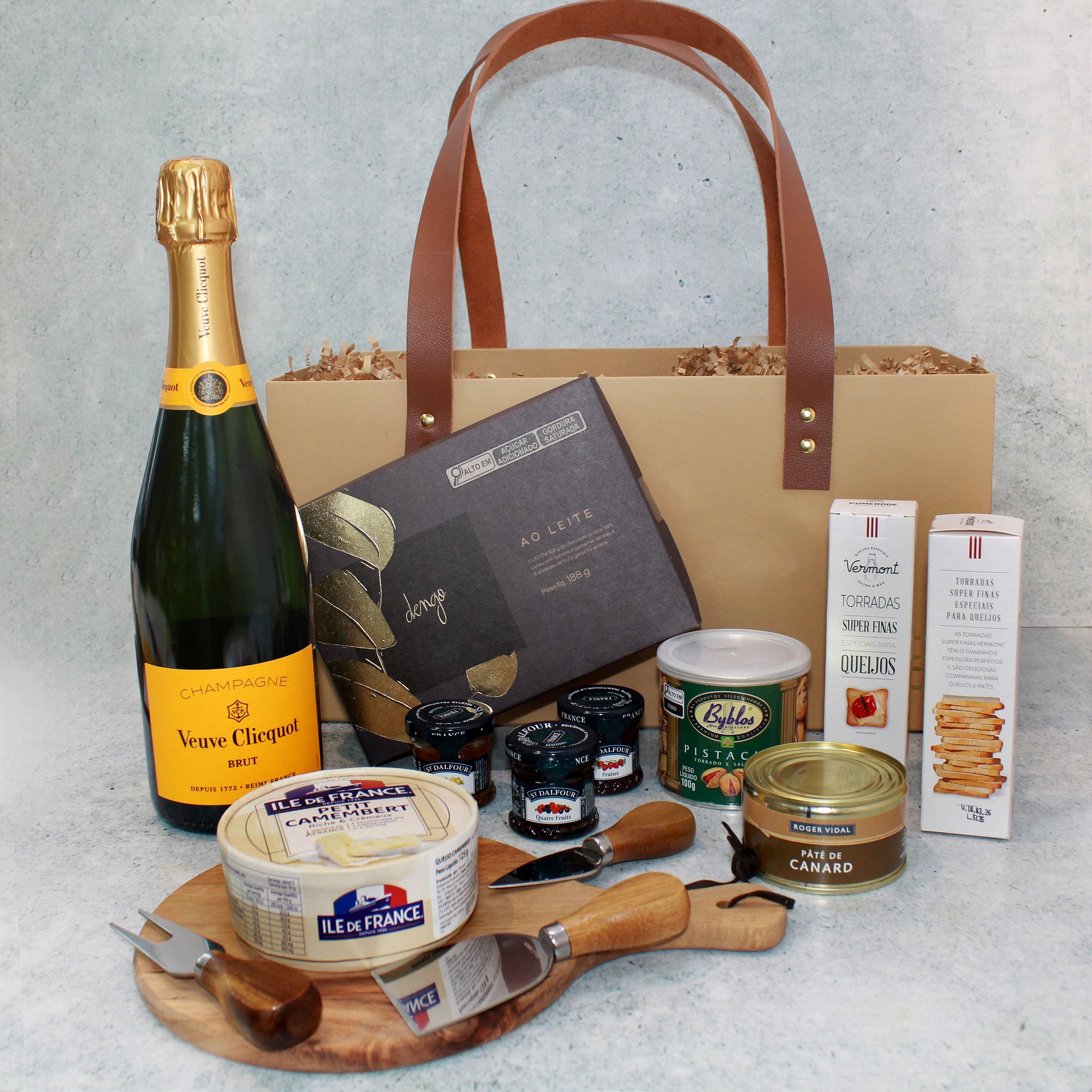 Surpreenda com um presente que une o icônico Champagne Veuve Clicquot Brut 🍾, a sofisticação do Queijo Brie Au Bleu 🧀, trufas e bombons artesanais 🍫, patê refinado 🦆, geleias delicadas 🍓 e pistaches crocantes 🌰.