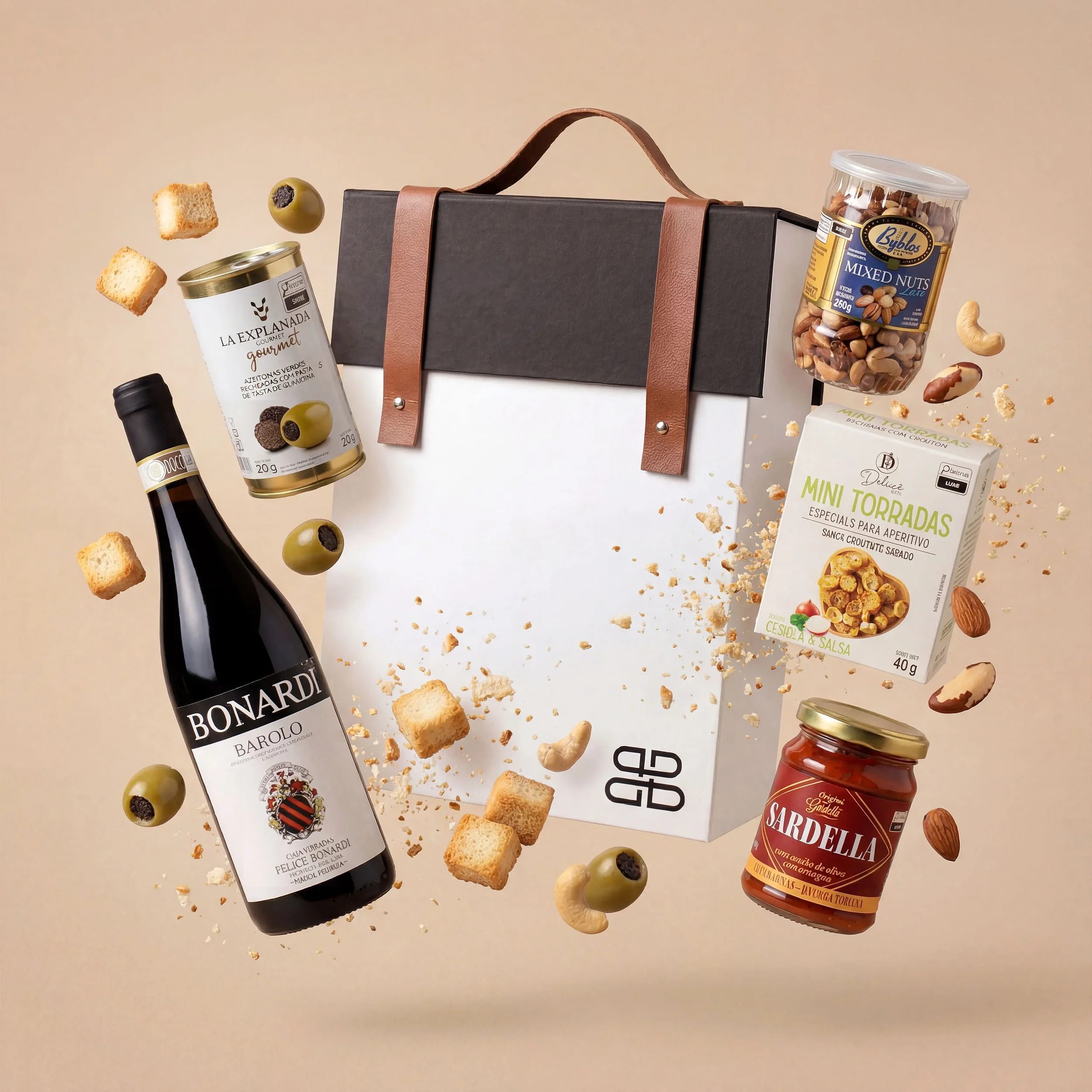 Para acompanhar um gigante, trouxemos marcas renomadas importadas e nacionais. O destaque vai para as exclusivas azeitonas espanholas recheadas com Pasta de Trufa, que elevam o paladar a outro patamar. Completam a experiência a intensa Sardella italiana, torradas crocantes e o requinte das castanhas Byblos.