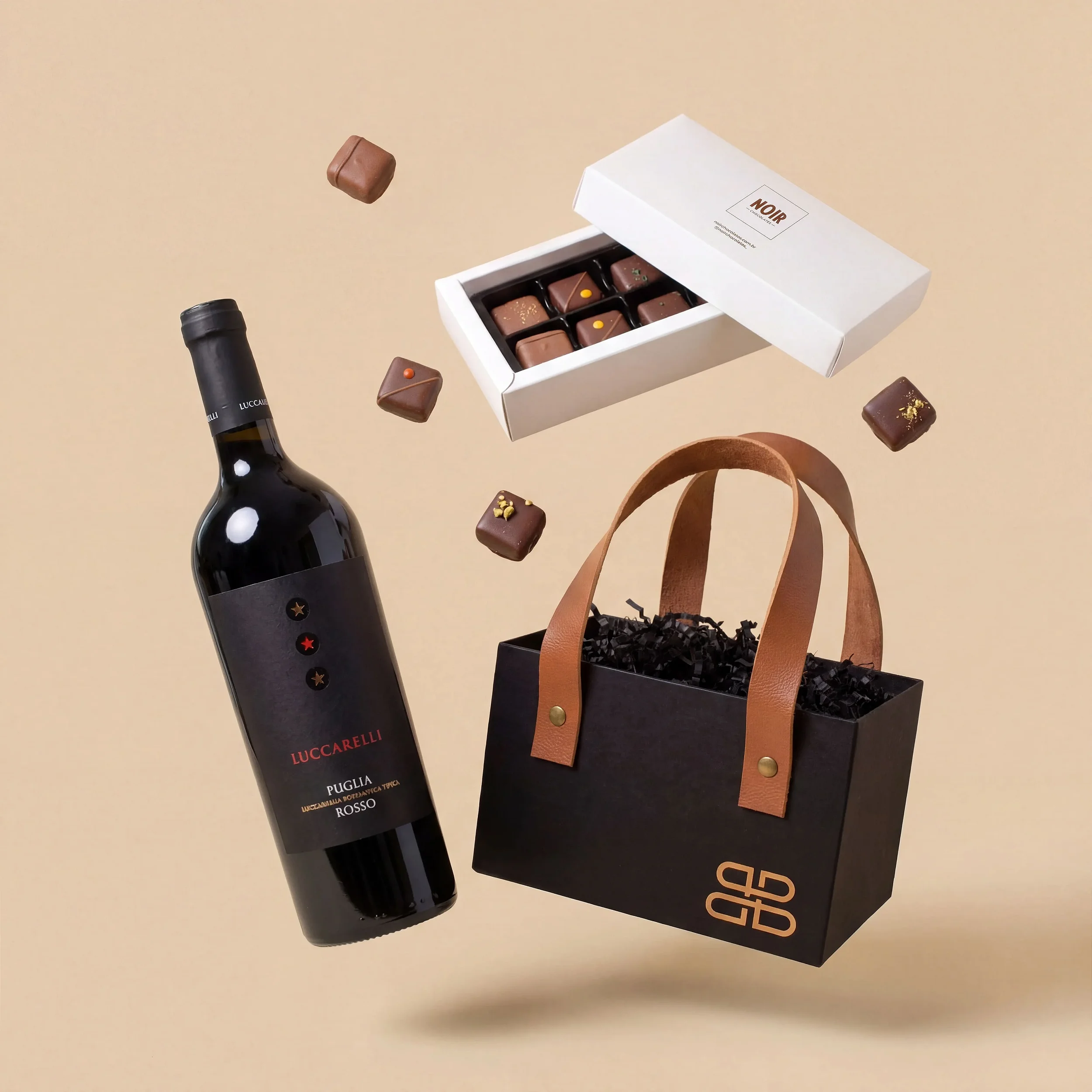 Uma viagem de sabores que começa no sul da Itália com o renomado Vinho Luccarelli Rosso, um tinto aveludado e acolhedor, e encontra o seu par perfeito no Brasil com a premiada Cacau Noir. A seleção de 8 ganaches gourmet (do pistache ao palet noir) derrete na boca, criando um momento de pura indulgência e relaxamento.